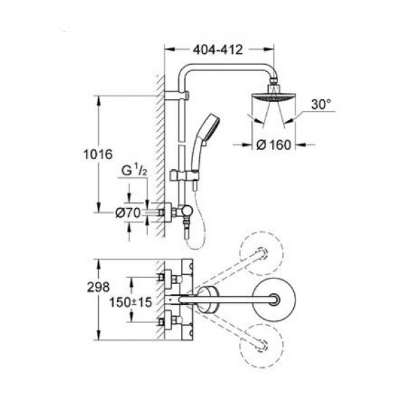 - - верхнійдуш Euphoria Cosmopolitan Ø 160 мм (арт. 28232000) з кульовим шарніром, кут повороту ± 15°
