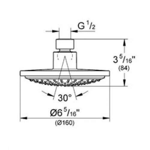 - Душовий диск Ø 160 мм, 1 режим Rain, кульовий шарнір +/- 15°, що обертається, різьбове з'єднання 1/2″.