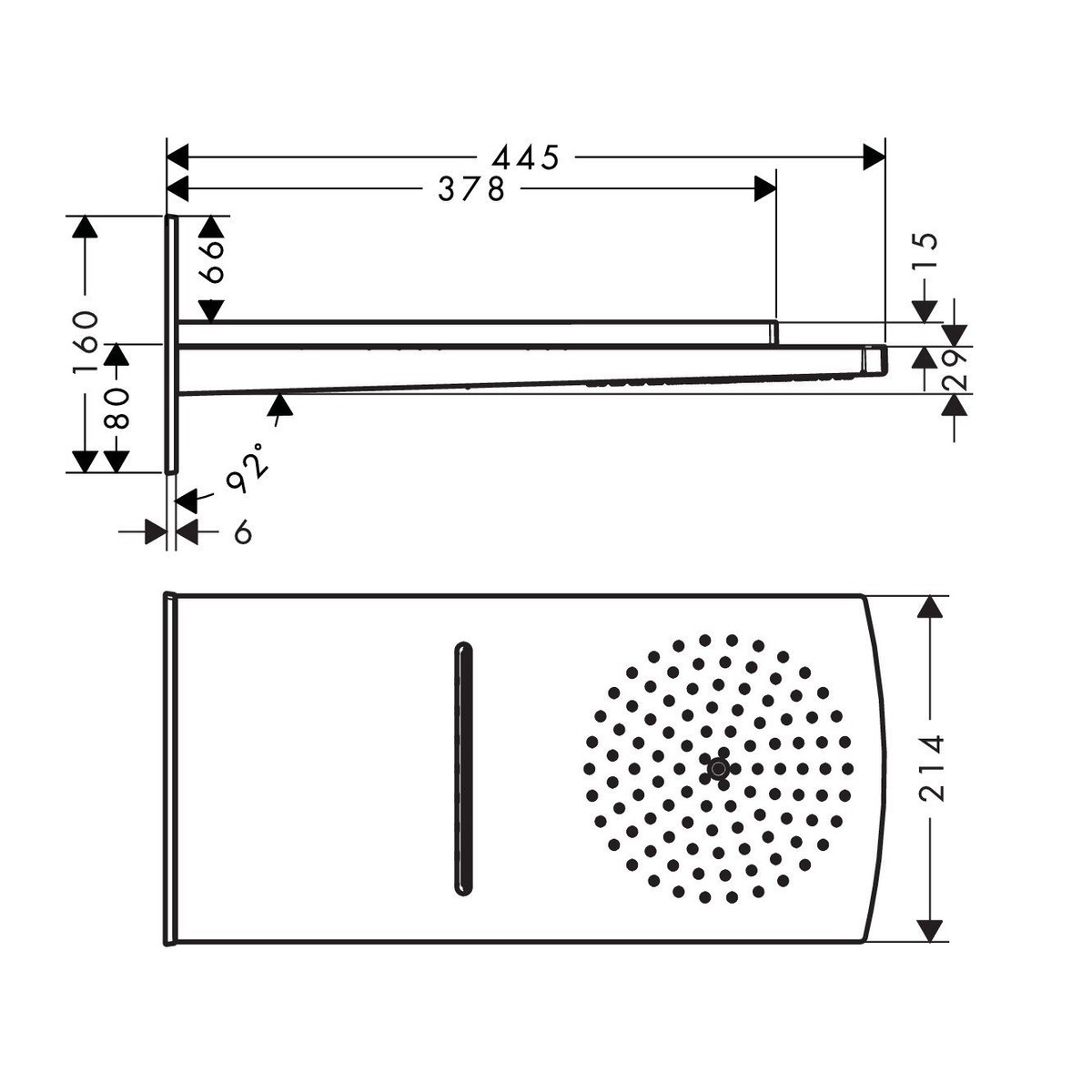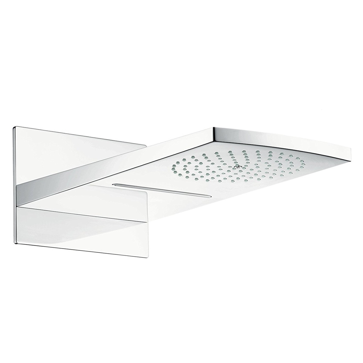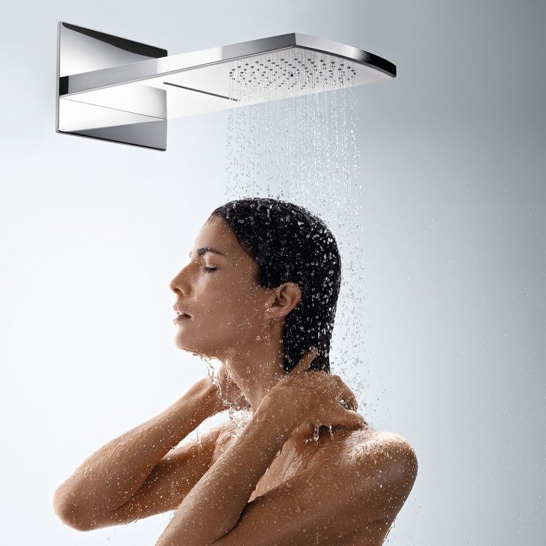 - Металевий легкоочисний душовий диск 445 х 214 мм, поверхня душового диска у двох варіантах: хром або білий, 3 типи струменя: RainAir 24 л/хв., злива 16 л/хв.