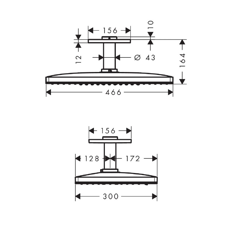 - Розмір душового диска 466 x 300 мм, 2 типи струменя: Rain 20 л/хв., RainStream 18 л/хв.