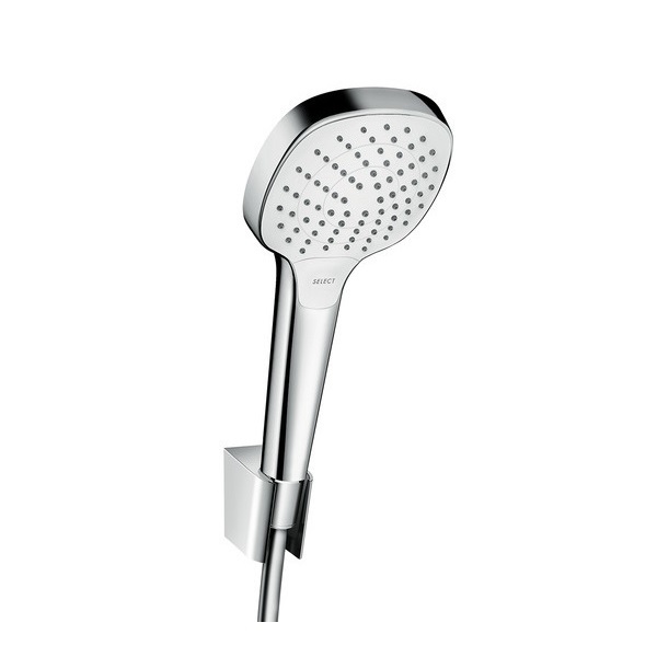 - Ручний душ Croma Select E Vario (арт. 26812400) - розмір душового диска 110 мм, 3 типи струменя: Rain, IntenseRain, Turbo Rain, перемикання типів струменя за допомогою кнопки Select, максимальна витрата води (при 3 бар) 15 л/хв.