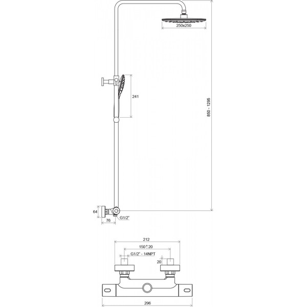 - душова штанга з можливістю регулювання по висоті 910-1340 мм, верхній душ із пластику ABS 250 х 250 мм, ручний душ - 3 функції