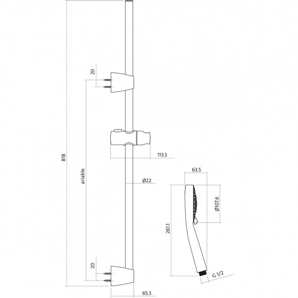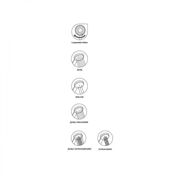 - Душова лійка: діаметр 107.6 мм,довжина 261 мм, 5 режимів:масаж, дощ, дощ+масаж, дощ+аеро, аеро