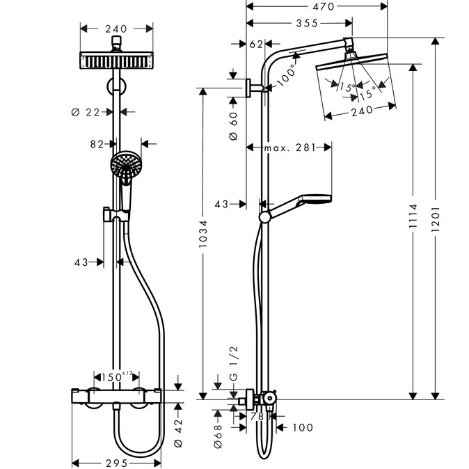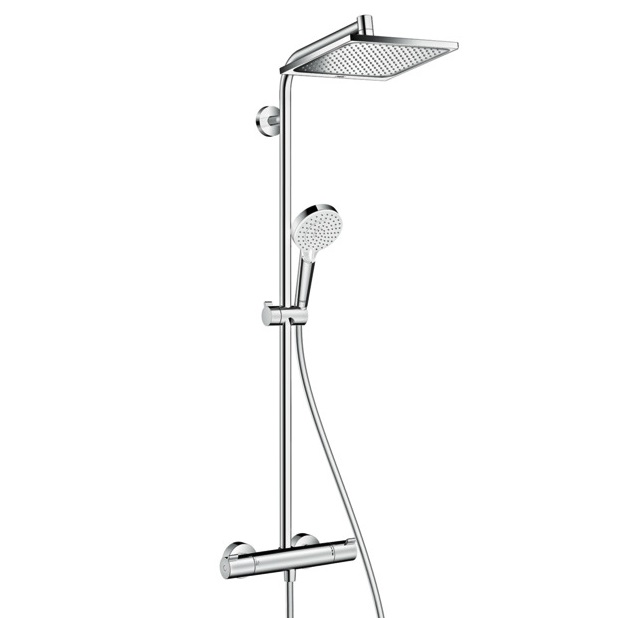 - Верхній душ Crometta E 240 (арт. 26726000), розмір душового диска 240 x 240 мм (пластиковий хромований), струмінь Rain, витрата води 15 л/хв., витрата води EcoSmart 9 л/хв., кут нахилу може змінюватися до 45°.