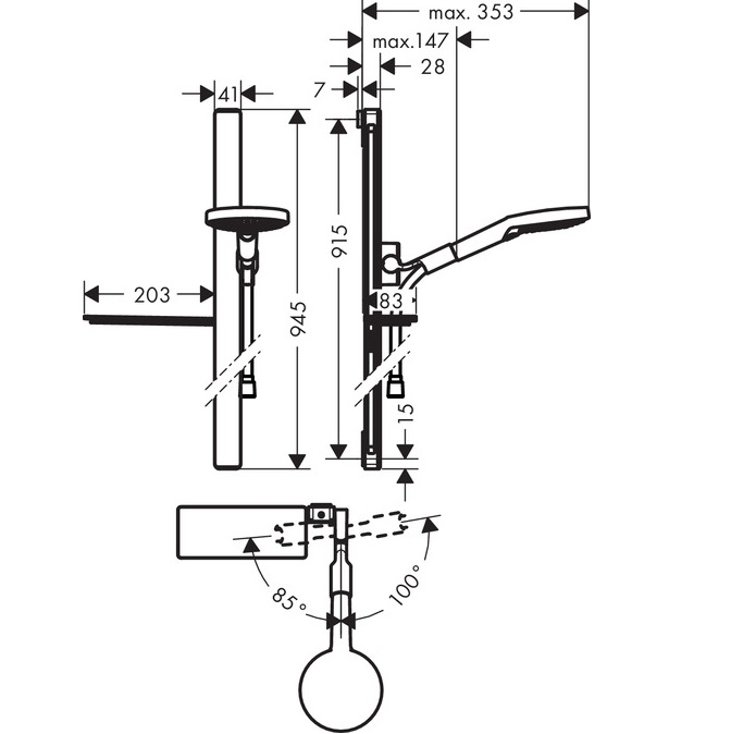 - Тримач ручного душу регулюється в межах 90°, повертається праворуч і ліворуч, переміщується вгору і вниз