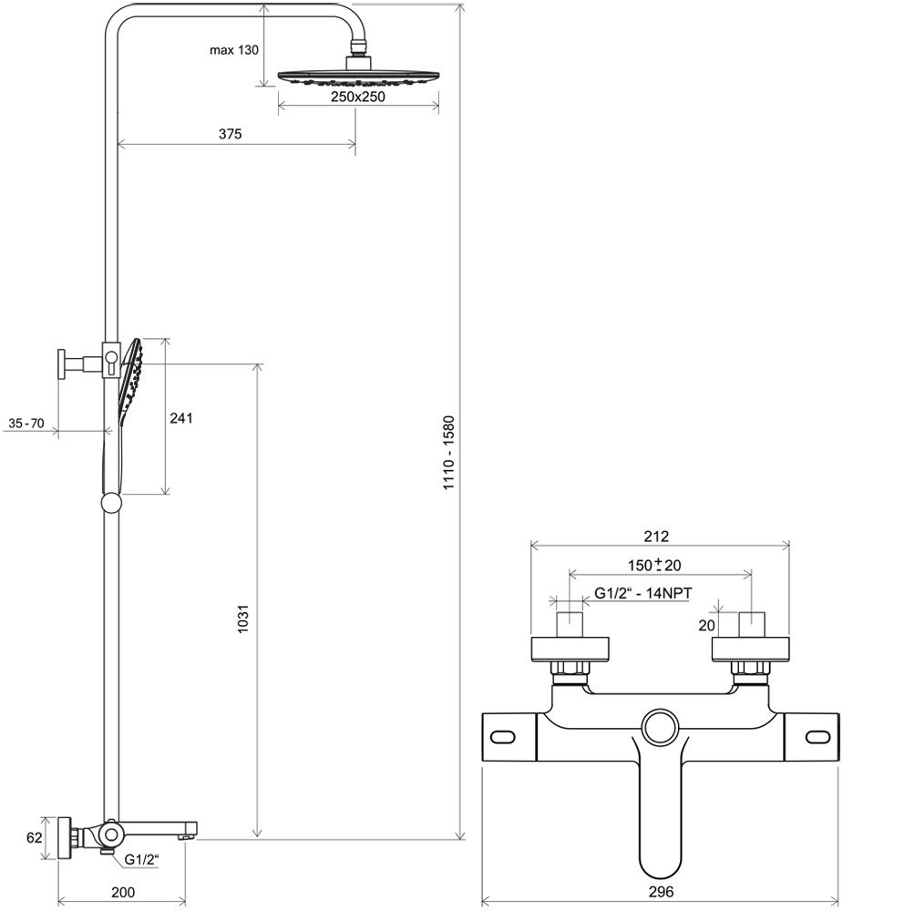 - висота змішувача 150 мм, висота термоштанги: гнучке регулювання висоти положення, в діапазоні 111-158 см
