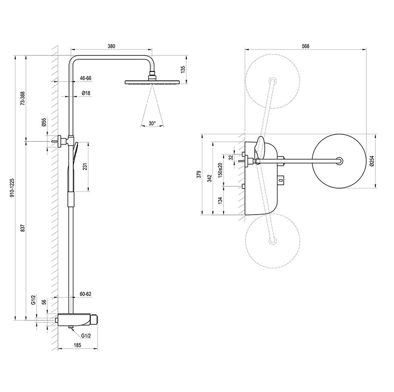 - висота змішувача 150 мм, висота термоштанги: гнучке регулювання висоти положення, в діапазоні 91-122.5 см