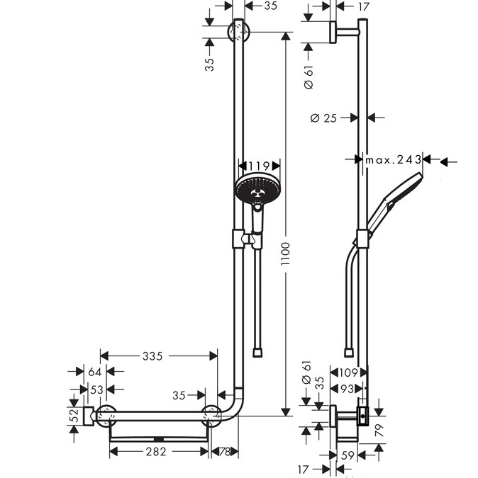 - Лівостороння штанга для душу Unica Comfort 1100 мм (арт. 26403400), ширина 25 мм, латунна