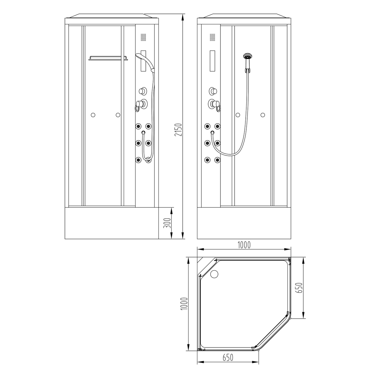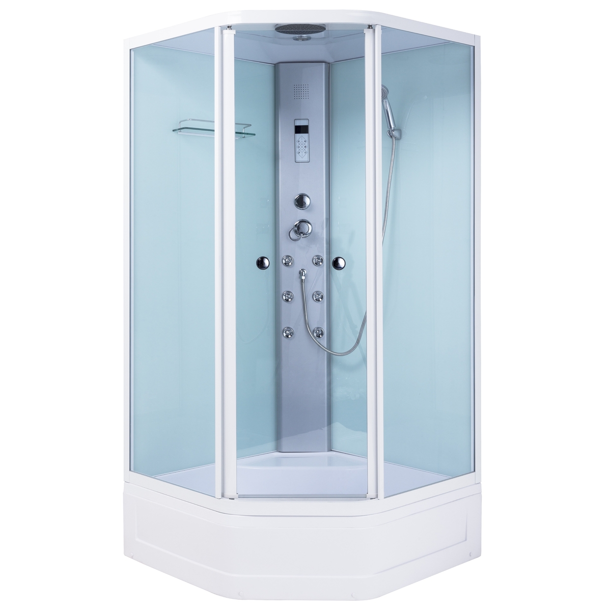 Комплектація: двері, 2 нерухомі передні стінки, 2 задні стінки, центральна панель у зборі з панеллю керування, акриловий дах у зборі, акриловий піддон на ніжках з лицьовою панеллю, електронна панель управління, радіо, витяжний вентилятор (суміщений із динаміком), підсвітка, верхній душ, гідромасажні форсунки - 6 шт, змішувач з перемикачем і душовою лійкою зі шлангом, сифон для душового піддону, рама, поличка скляна, латунні кріплення і петлі, металеві ручки, комплект силіконових ущільнювачів.