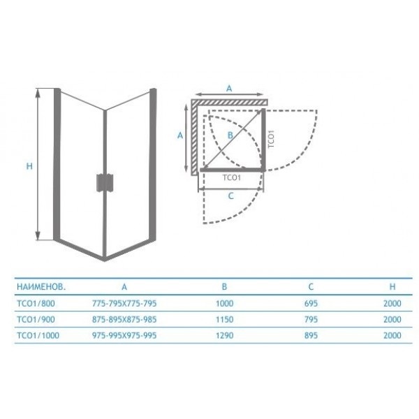 - 875-895 х 875-895 х 2000 мм, ширина входу 795 мм