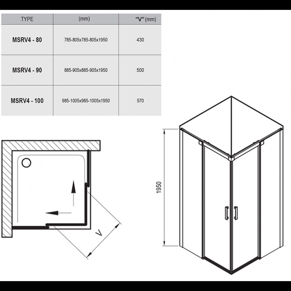 Душовий куточок Ravak Matrix MSRV4 - складається з двох рівних нерухомих частин і двох рівних рухомих частин, що утворюють розсувні двері.