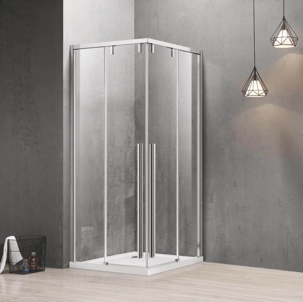 - скло прозоре гартоване 8 мм, профіль і комплектуючі в кольорі хром, металеві двосторонні ручки, алюмінієві широкі профілі, петлі латунні
