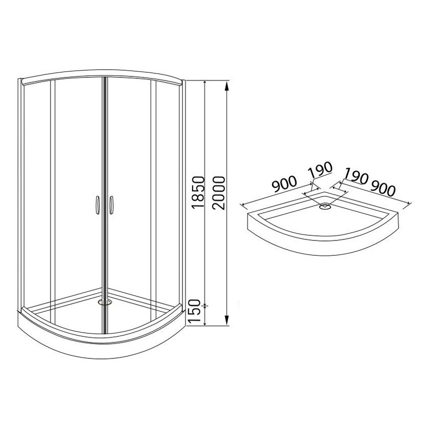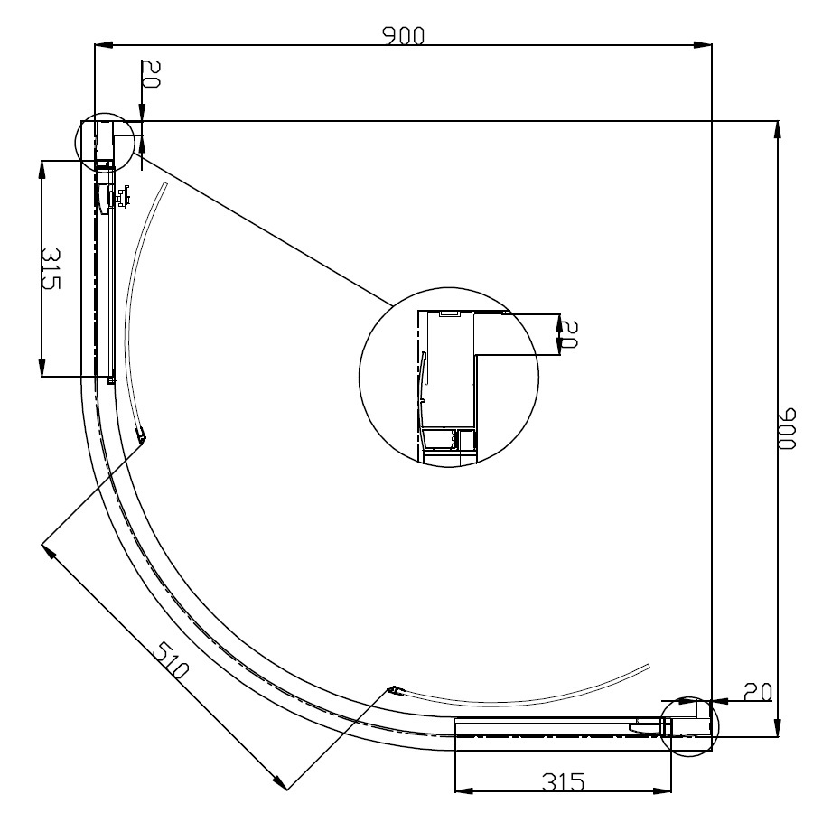 - 900 x 900 x 2000 мм, висота з урахуванням піддону, двері розсувні з шириною входу 510 мм