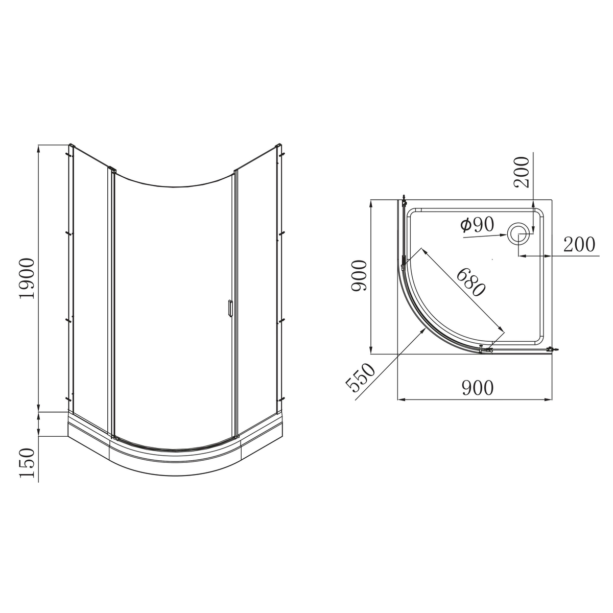 - 900 x 900 x 2050 мм, R550, висота з урахуванням піддону, двері орні з шириною входу 680 мм, може бути встановлена як з лівим, так і з правим відкриванням дверей