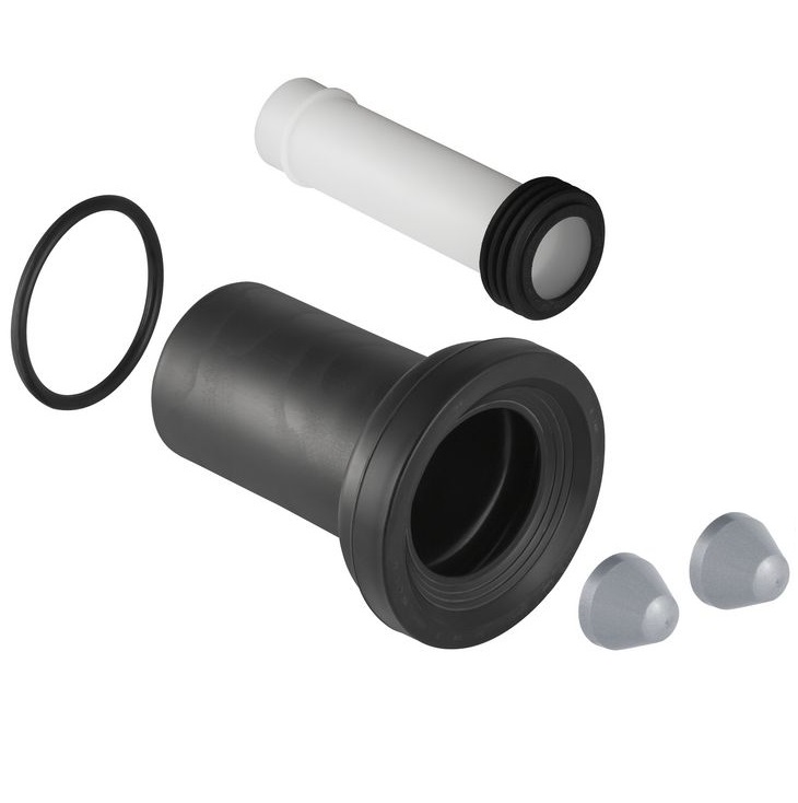 - комплектація: заглушки для болтів-тримачів унітазу, зливна труба діаметр 90 мм, сполучна манжета, сполучна трубка діаметр 45 мм