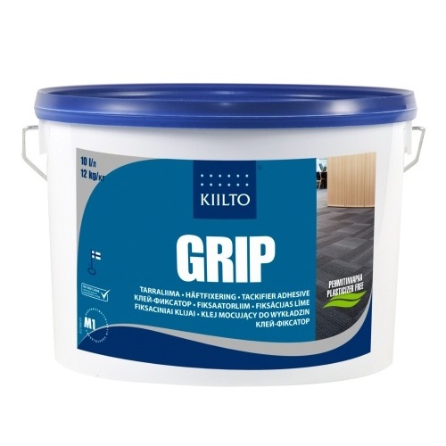 Kiilto Grip - клей-фіксатор для монтажу знімних і не знімних підлогових покриттів, модульних килимових покриттів, рулонних ПВХ, текстилю, на нових і старих поверхнях.