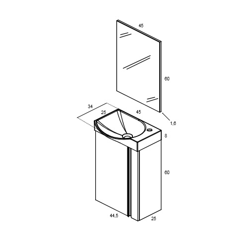 - тумба: 445 х 250 х 600 мм, 1-но дверна, дверцята розпашні, матеріал: ДСП, МДФ, поверхня фасадів біла глянцева