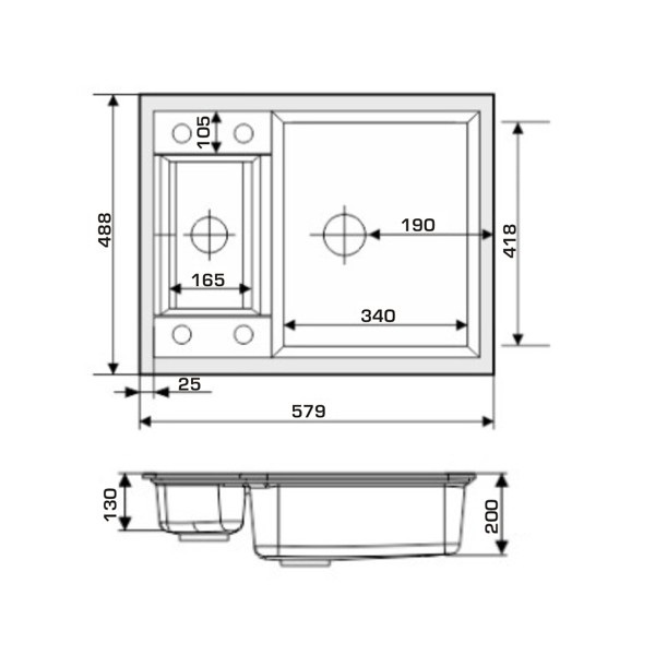 - загальний розмір 579 х 488 х 200 мм, чаша 340 х 418 х 200 мм / 165 х 288 х130 мм