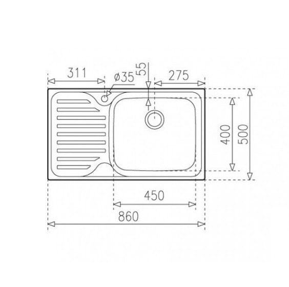 - загальний розмір: 860 х 500 х 200 мм, розмір чаші: 450 х 400 х 200 мм