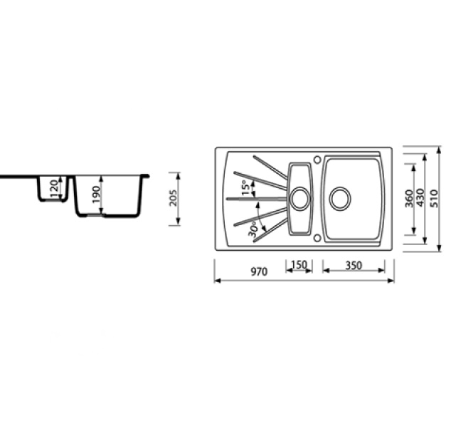 - розмір чаш: 350 x 430 x 190 мм / 150 х 360 х 120 мм