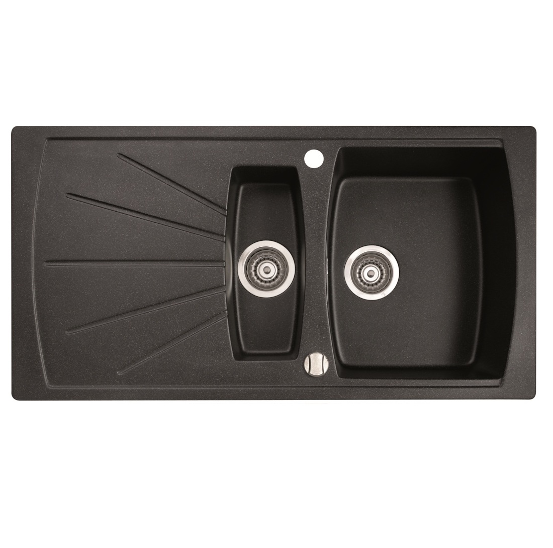 Врізна мийка з двома чашами. У комплект також входить зливна арматура, каналізаційний сифон і автоматичний клапан.