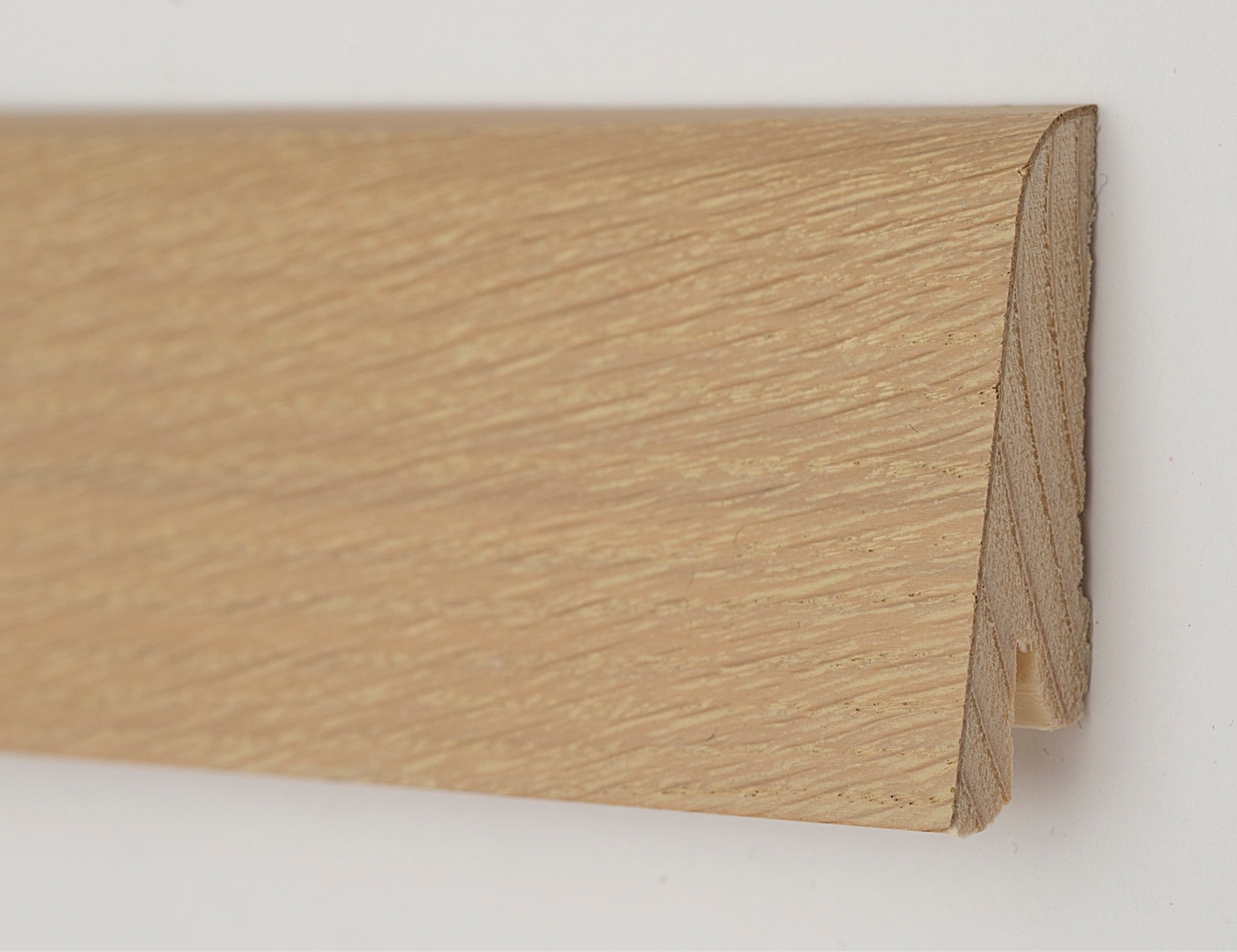 Плінтус для підлоги, виконаний зі зрощеної сосни, є більш стійким до перепадів температур і впливу вологості в приміщенні, ніж масивний плінтус із суцільного дерева. Покриття плінтуса шпоном (тонкий зріз натурального дерева цінних порід) дає можливість виготовляти плінтуси підлогові у різних породах деревини та в широкому розмаїтті кольорів.Завдяки використанню сосни, як недорогої деревини для основи плінтуса, купити якісний дерев'яний плінтус стало можливим для багатьох шанувальників натуральних матеріалів в інтер'єрі. Звичайно ж незаперечною перевагою плінтуса шпонованого є екологічна та естетична властивість, в порівнянні зі штучними пластиковими і МДФ плінтусами.