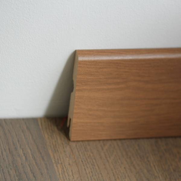 Виготовляється плінтус з МДФ дуже високої якості та зі шпону. Під час виготовлення плінтуса з МДФ застосовується метод пресування дрібної деревної стружки за високого тиску і температури. Клейкими речовинами є парафін або легнін. Отриманий таким чином матеріал вирізняється високою екологічною чистотою і абсолютно безпечний для людини.