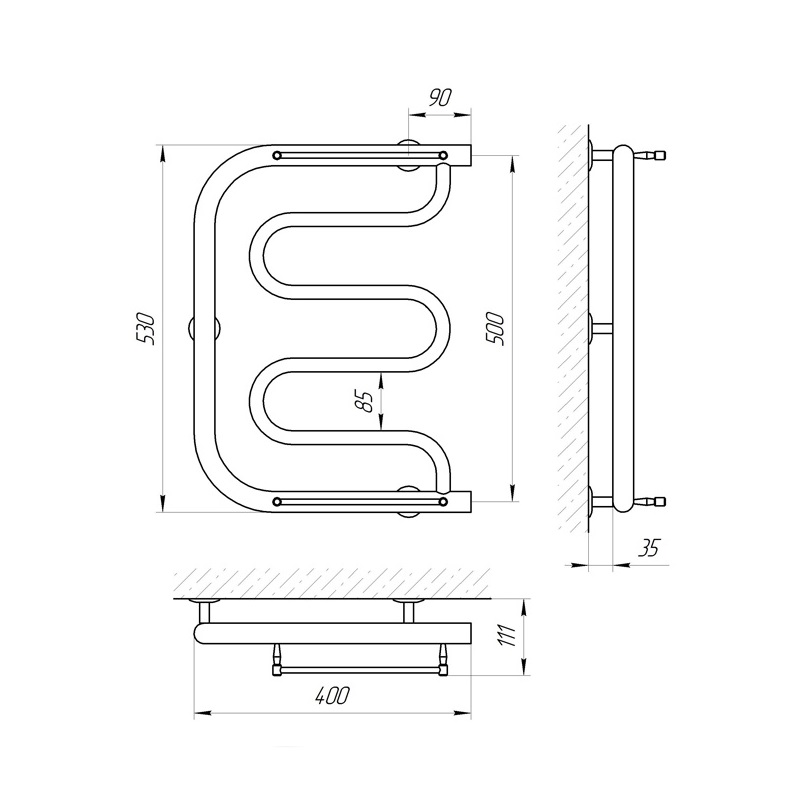- відстань між центрами підключення (бокове підключення) В - 500 мм