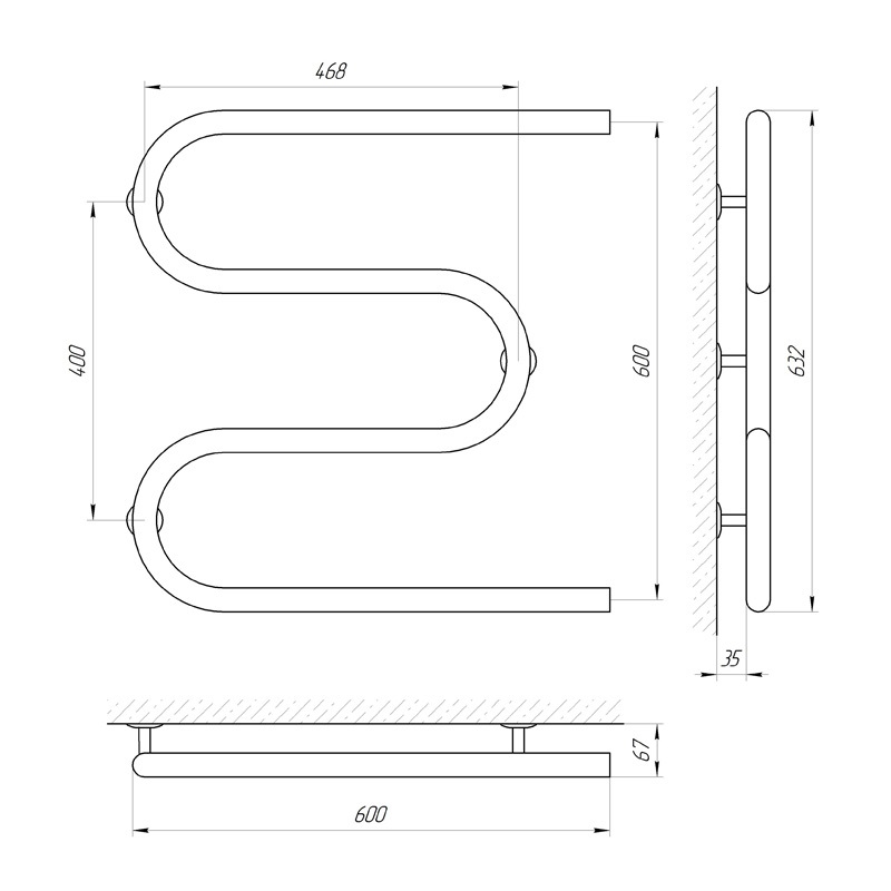 - відстань між центрами підключення (бокове підключення) В - 600 мм