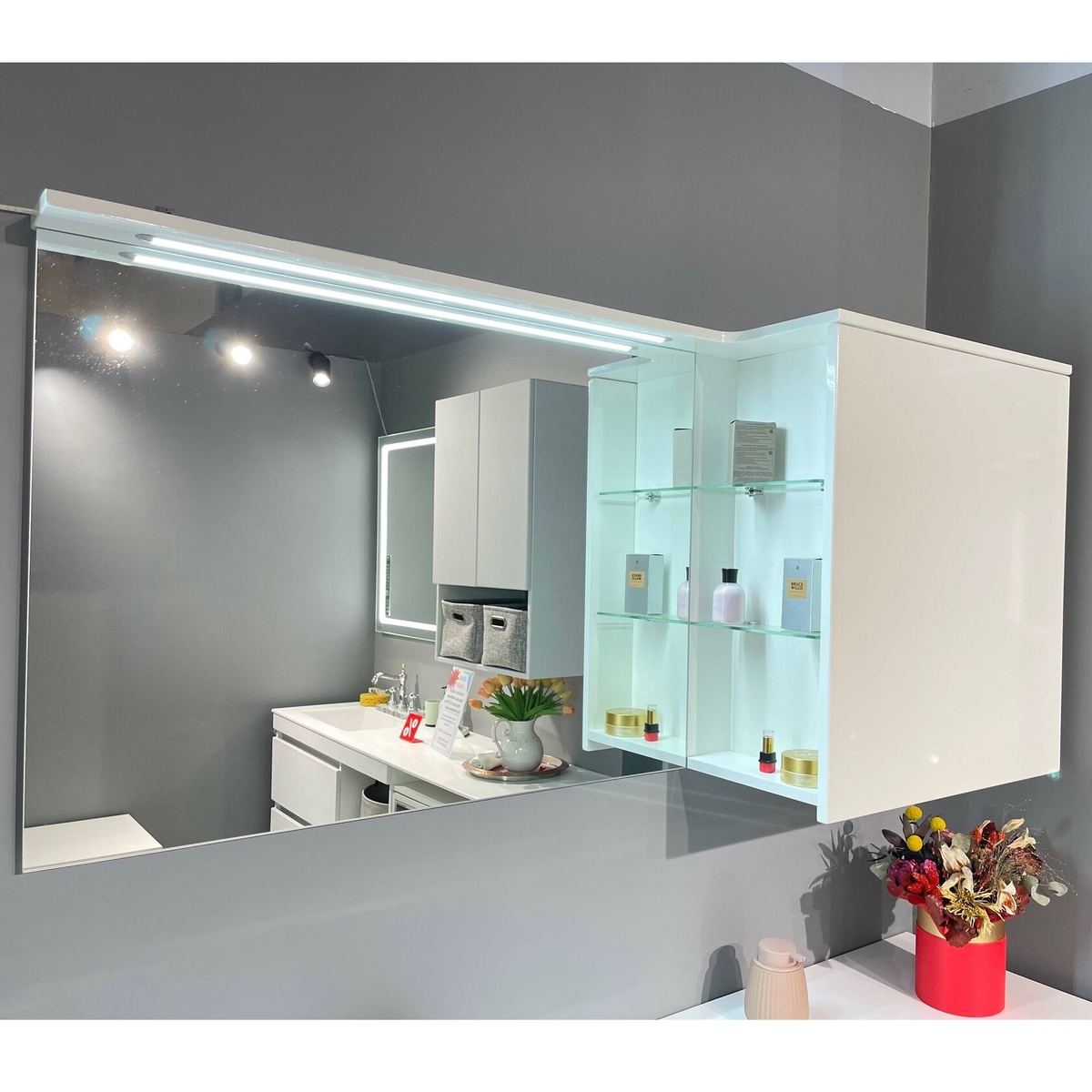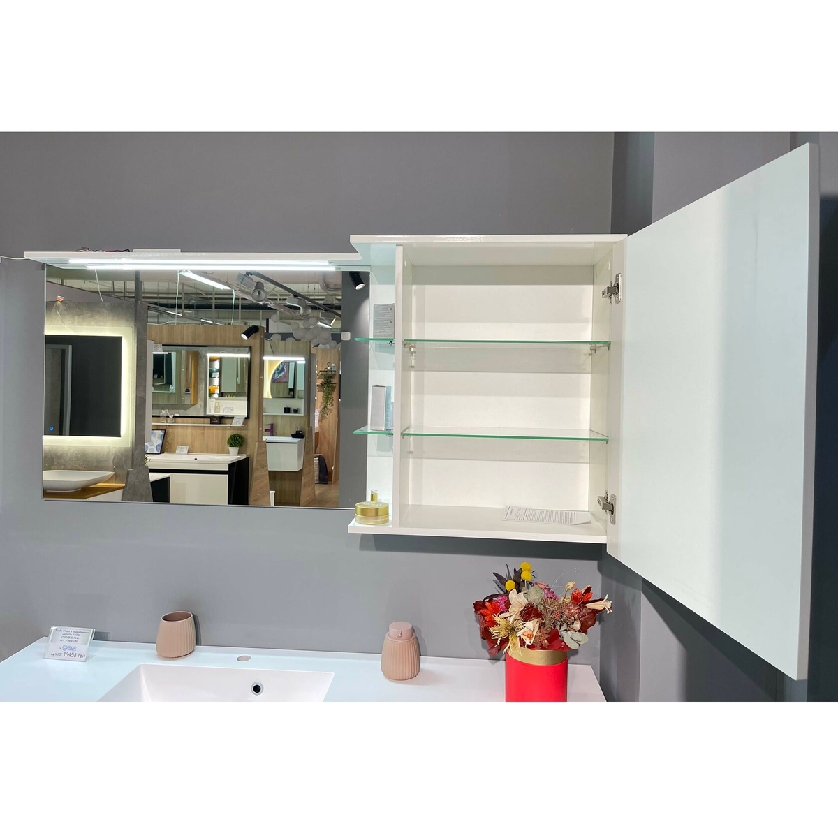 - верхнє LED-підсвічування над дзеркалом, вимикач: сенсор дотику з функцією пам'яті, потужність 5 Ватт