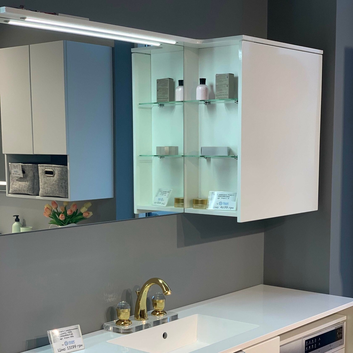 - закрита шафка (розташування ліворуч/праворуч) з 1 орними дверцятами, відкривання - петлі з плавним закриттям, усередині 2 скляні полиці, з бічної частини шухляди розташовані 2 відкриті скляні полиці