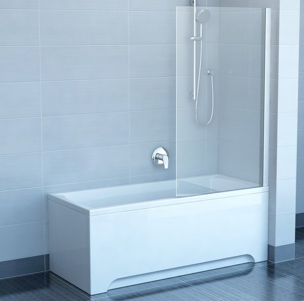 Універсальна штора CVS1, підходить для прямокутних ванн Ravak з рівним переднім бортом. Штора одноелементна, складається з однієї рухомої частини, яку можна повернути назовні ванни.