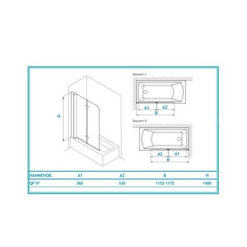 Душова штора QP97 для ванн Koller Pool - двоелементна шторка з можливістю складання першої половинки скла (шириною 530 мм) назовні. Друга половинка складається на 180 градусів, що дає змогу заощадити простір ванної кімнати.
