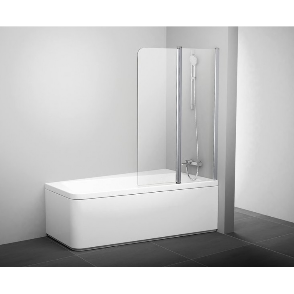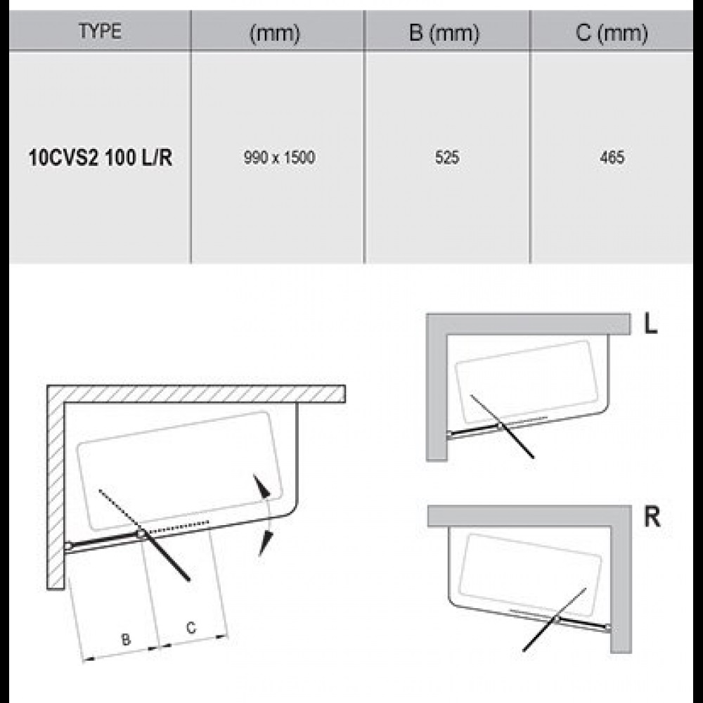 Штора 10CVS2-100 - двоелементна, для прямокутної ванни. Поворотний механізм дає змогу складати штору як всередину ванни, так і назовні, що, своєю чергою, полегшує догляд за склом і надає широкий вхід у ванну.