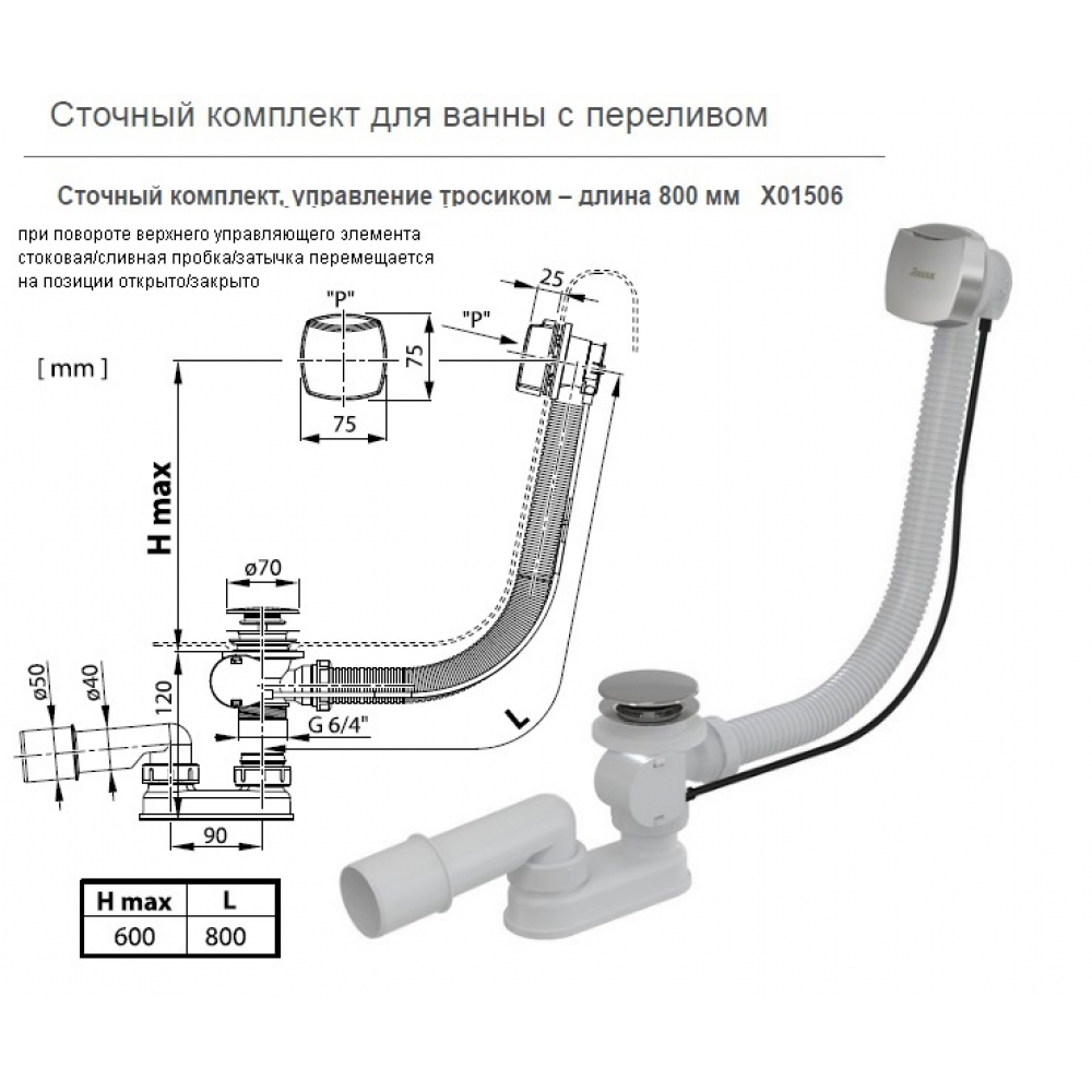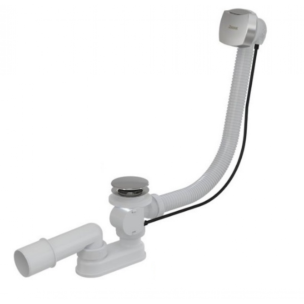 Сифон для ванни з переливом усіх типів. Довжина 80 см. Поверхня кришки переливу і зливу покрита хромом. Керування тросом, напівавтоматичне.