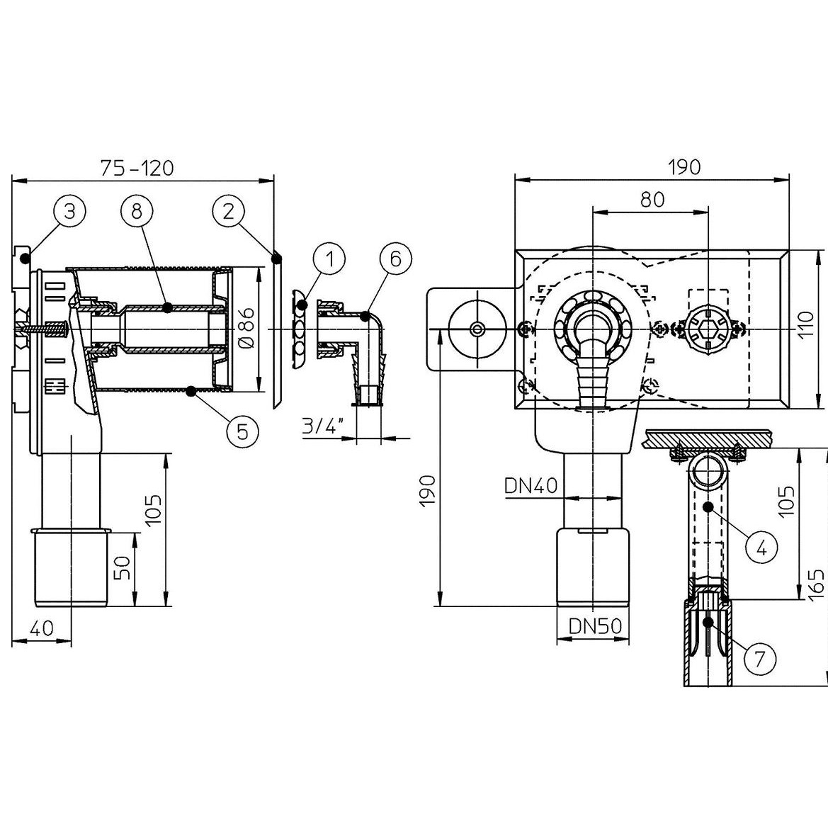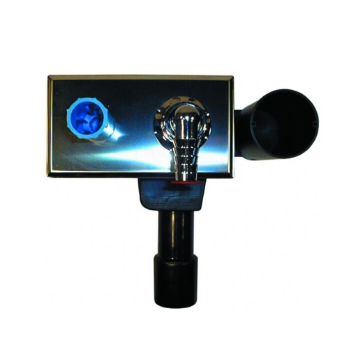 Вбудований сифон для пральної або посудомийної машини DN40/50 з інтегрованим під'єднанням води (настінна пластина впускний отвір / випускний отверсіє R 1/2" внутрішнє різьблення), зі знімним корпусом оболонки, пластиною для монтажу, з'єднувальним коліном 3/4" HL19.C і декоративною плитою з нержавіючої сталі 100 х 180 мм. Монтаж: 75мм.