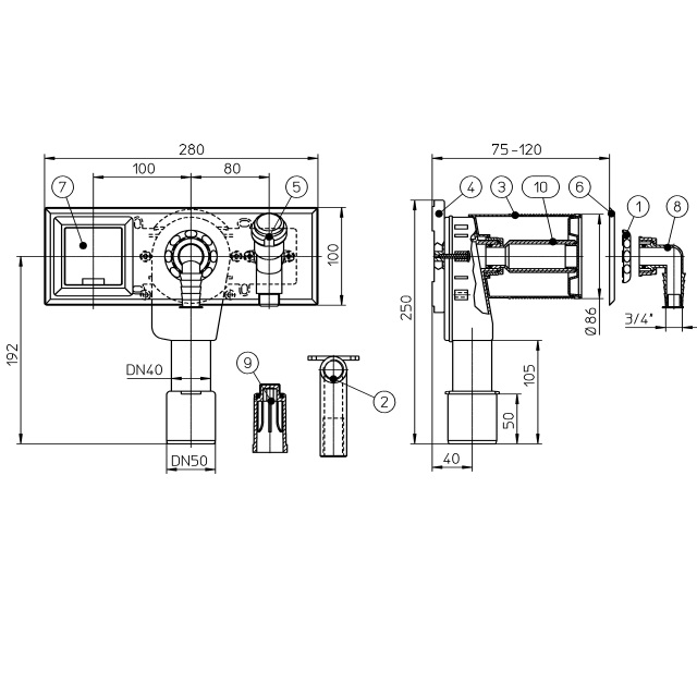Вбудований сифон для пральної або посудомийної машини DN40/50 з інтегрованим під'єднанням води (настінна пластина впускний отвір / випускний отверсіє R 1/2 "внутрішнє різьблення), з водопровідним краном R 1/2" із запобіжним затвором зворотного потоку води, з електричною розеткою (230V), зі знімним корпусом оболонки, пластиною для монтажу, з'єднувальним коліном 3/4 "HL19.C і декоративною плитою з нержавіючої сталі 100 х 180 мм. Монтаж: 75мм.