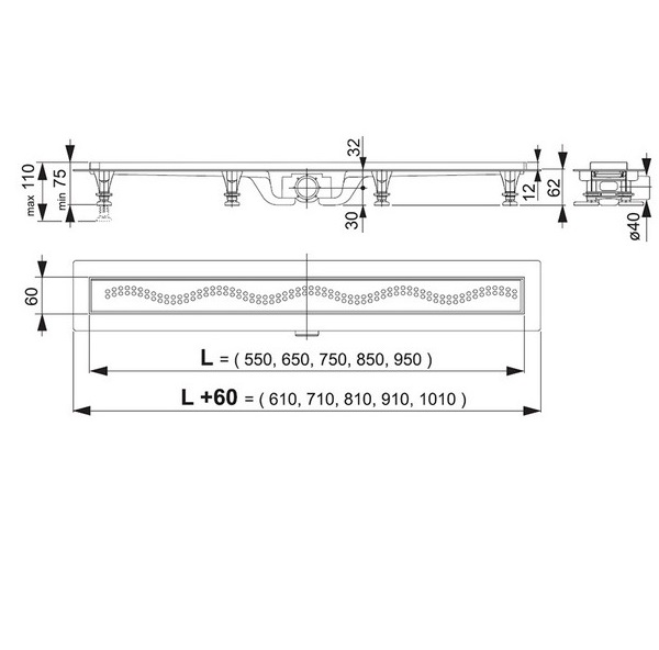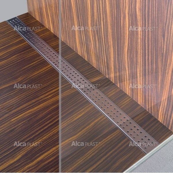 Водовідвідний жолоб призначений для встановлення перфорованої решітки. Нержавіючий поріг жолоба формує візуальний перехід між плиткою і вставленою решіткою. Вода втікає в жолоб через краї та отвори решітки. Жолоб може бути встановлений на відкритій ділянці або до стіни душової поверхні.