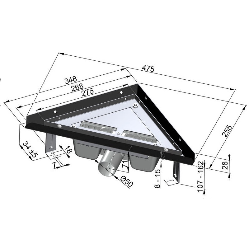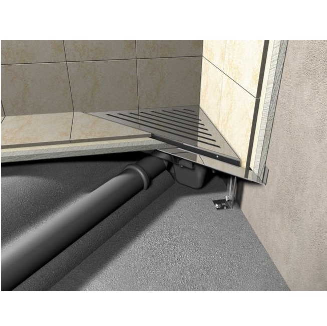 Ринва призначена для встановлення виключно в кут душової, де стіни мають хорошу ізоляцію. Вертикальний "комір" забезпечує простоту установки і чудову ізоляцію стін душової. Жолоб призначений для встановлення масивних перфорованих решіток. Нержавіючий поріг жолоба утворює візуальний перехід між плиткою і вставленою решіткою. Вода протікає в жолоб через краї та отвори жолоба.