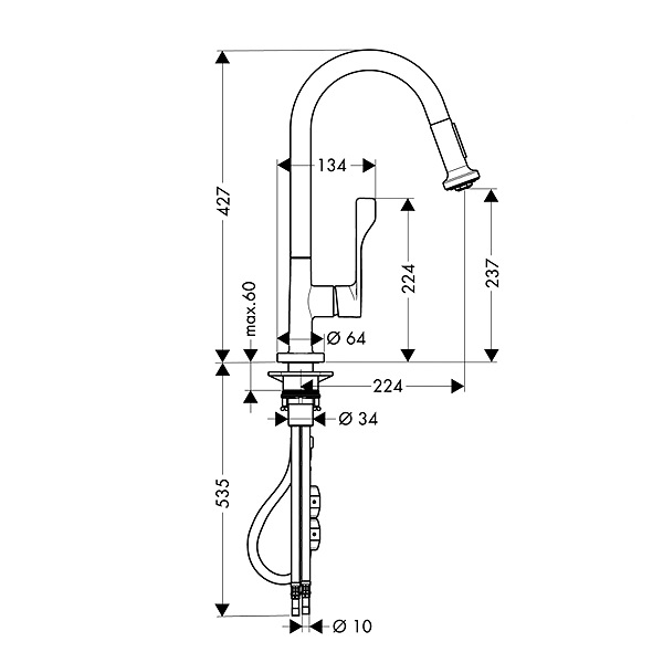 - Загальна висота 427 мм, поворотний вилив на 110°/150°: висота 246 мм, довжина 220 мм