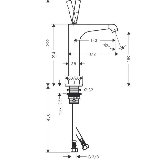 - Загальна висота змішувача 299 мм, литий вилив: висота 189 мм, довжина 172 мм, ламінарний струмінь, витрата води 5 л/хв.