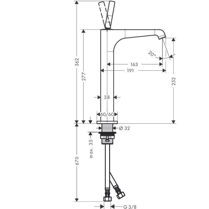 - Загальна висота змішувача 362 мм, литий вилив: висота 252 мм, довжина 163 мм, ламінарний струмінь, витрата води 5 л/хв.