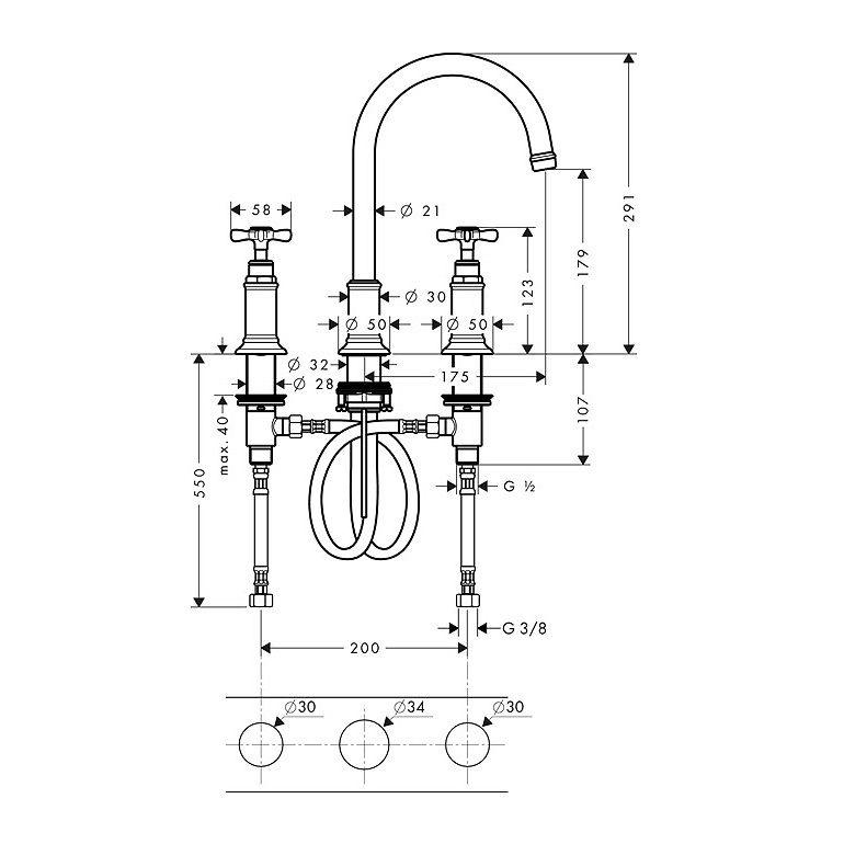 - Загальна висота 291 мм, ширина 200 мм, поворотний вилив на 120°: висота 179 мм, керамічні вентилі з поворотом на 180° висотою 123 мм