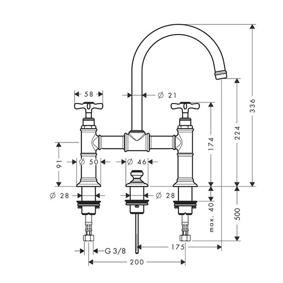 - Загальна висота 336 мм, ширина 200 мм, поворотний вилив на 120°: висота 224 мм, керамічні букси з поворотом на 90° висотою 174 мм