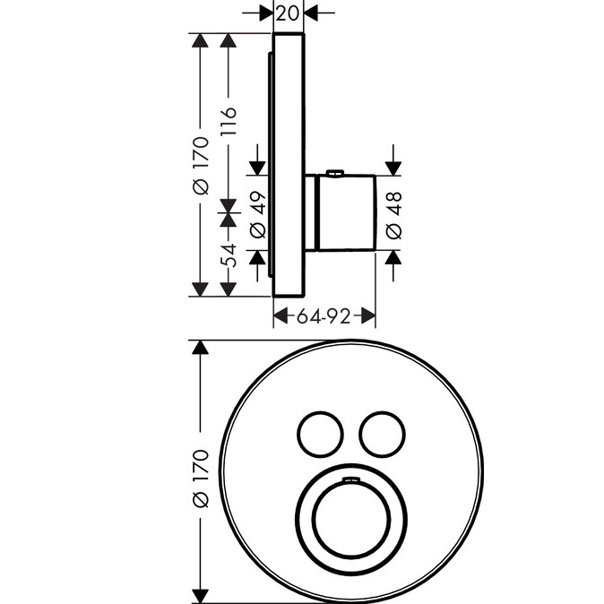 Термостат Hansgrohe Axor ShowerSelect - відмінною рисою є кнопка управління Select - завдяки якій, Ви зможете одним клацанням увімкнути або вимкнути подачу води або змінити тип струменя.