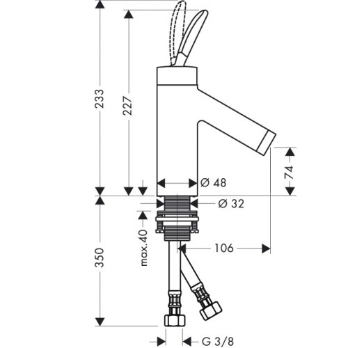 - Загальна висота змішувача 227/223 мм, литий вилив: висота 74 мм, довжина 106 мм