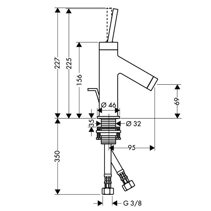 - Загальна висота змішувача 227 мм, литий вилив: висота 69 мм, довжина 95 мм