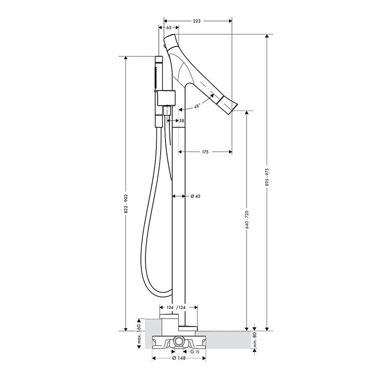 - Загальна висота 975 мм, литий вилив: винос 223 мм
