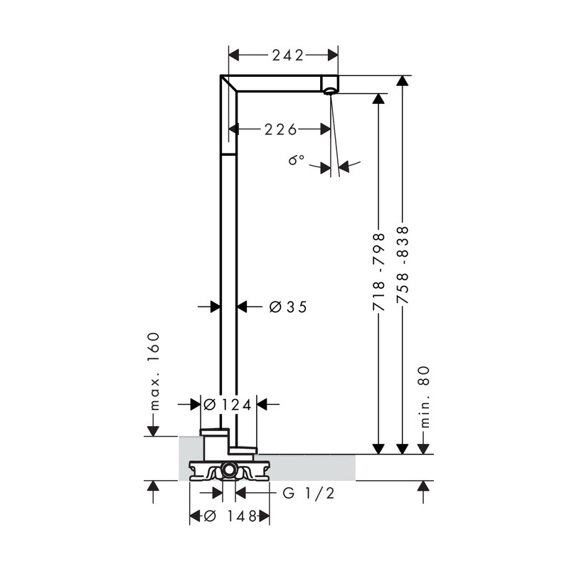 - Загальна висота 838 мм, винос виливу 242 мм, звичайний струмінь, витрата води 20 л/хв.