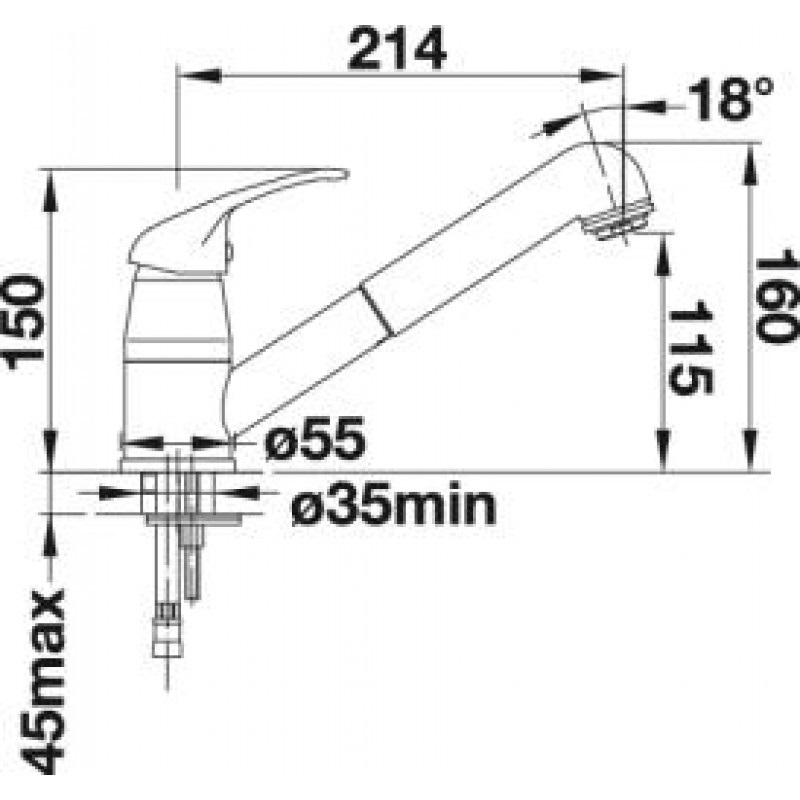 - загальна висота 150 мм, поворотний вилив80°: висота 115 мм, довжина 214 мм